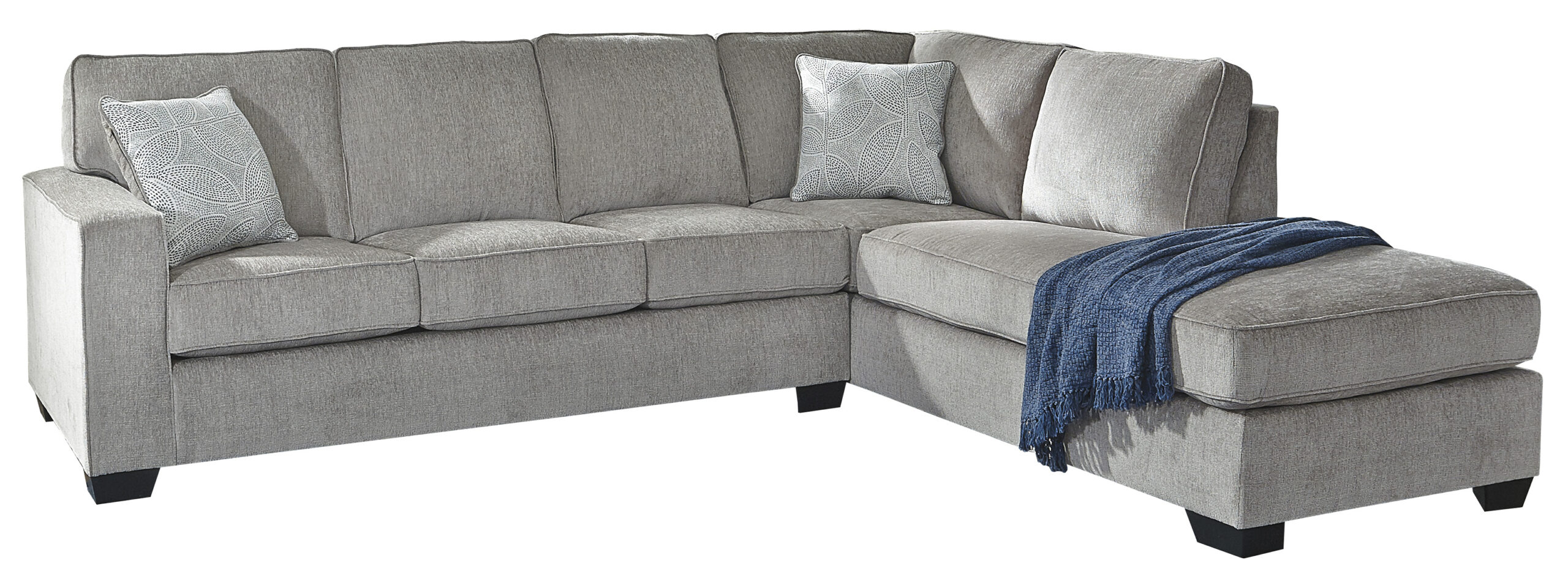 If style is the question, then this sectional is the answer. Sporting clean lines and sleek track arms, the decidedly contemporary profile is enhanced with plump cushioning and a chenille-feel upholstery, so pleasing to the touch. Sure to play well with so many color schemes, this sectional in slate gray includes a pair of understated floral pattern pillows for fashionably fresh appeal.